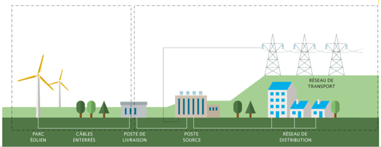 Aujourd’hui, le projet pourrait se raccorder au poste source d’Yzeure (Allier). C’est ENEDIS (ex ERDF) qui définira la solution technique optimale de raccordement. L’électricité produite est injectée sur le réseau électrique à partir du poste de livraison, lequel marque la limite entre le parc éolien et le réseau public d’électricité (géré par ENEDIS). L’électricité injectée dans le réseau est consommée au plus proche, elle ne peut être dirigée vers un endroit car elle est injectée sur le réseau de distribution. Les électrons « vont au plus proche » des lieux de consommation.